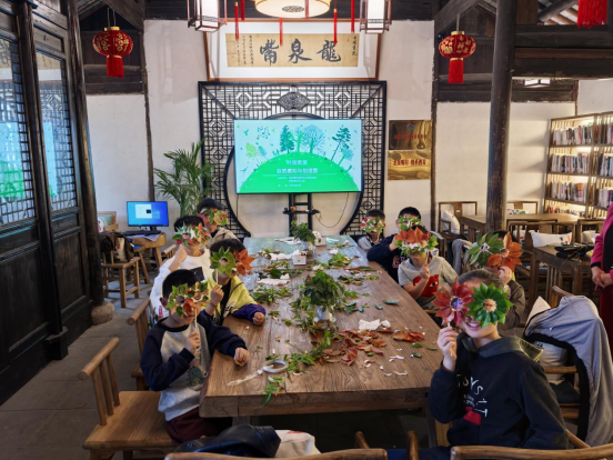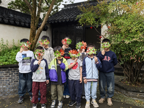 然后,他们来到黄杨书院,把自己收集到的喜欢的树叶,做成不同的树叶面具。小朋友们沉浸其中,没一会儿一个个独具特色的面具就完成啦!大家拿着自己的作品纷纷在脸上比划着,十分开心。