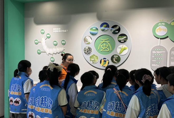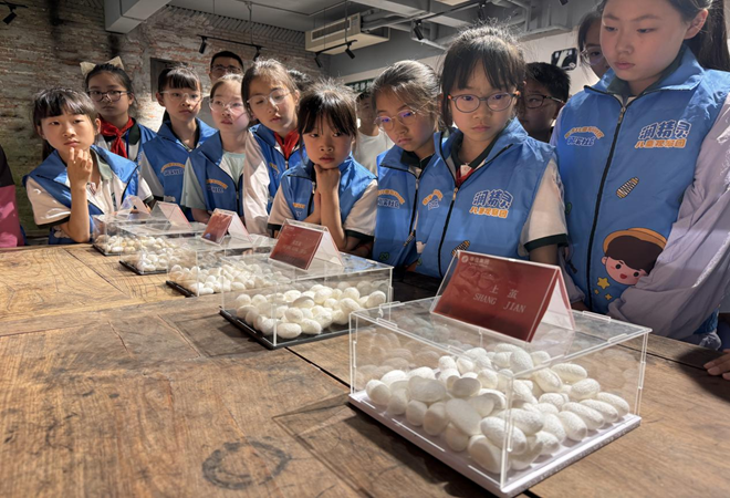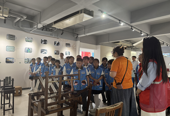 江苏华佳集团是一家位列中国丝绸行业前3强,集育种、种桑、养蚕、缫丝、捻线、织造、印染、服装一条龙研发、生产与贸易一体化的真丝绸专业企业。活动当日,小精灵们踏入华佳集团缫丝博物馆,开启对丝绸历史的沉浸式体验。展馆内陈列着古法缫丝工具、手工织机以及历代丝绸文物,斑驳的木梭、泛黄的丝线无声诉说着“丝路”千年的沧桑。讲解员以“一粒茧”为起点,演示传统缫丝工艺。孩子们围坐在复刻的古法缫丝台旁,亲眼见证蚕茧在热水中舒展,丝线被一双巧手缓缓抽离的过程。