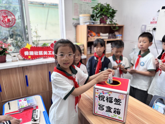 随后,孩子们将写满祝福的书签小心翼翼地投入祝福签盲盒箱。“我觉得这个活动特别有意思,我写了好多祝福的话,希望收到我书签的小朋友能感受到快乐。”二(2)班管同学开心地说道。另一位孙同学也表示:“制作书签和写祝福语的过程,让我觉得很幸福,原来给予别人祝福是这么快乐的事情。”