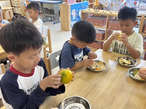 分组进行的秋食制作,小朋友们在教师的带领下,将水果、蔬菜清洗剥皮后,撒上沙拉酱,一盆盆美味可口的水果蔬菜沙拉就完成啦!小朋友们互相分享自己制作的美食,大家沉浸在对秋季的美好畅想中。